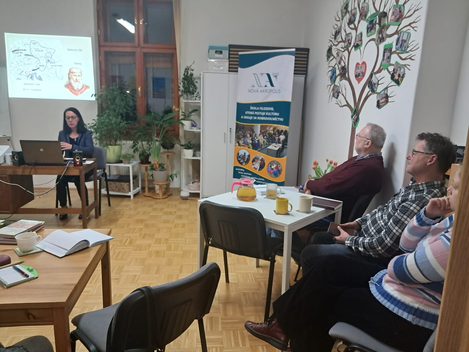 During two january evenings, the participants of the course Slavs dedicated themselves to learning about the interesting and still not fully revealed culture of Slavs, who settled and lived in the territory of present-day Slovakia several centuries ago. At the first meeting, they talked about the history of this culture and the most important personalities associated with the location of Slovakia. During the second meeting, they focused on the godheads of the rich Slavic pantheon, myths, traditions and symbols. And during the breaks, they inspired each other with interesting books dedicated to the topic of the Slavs.
