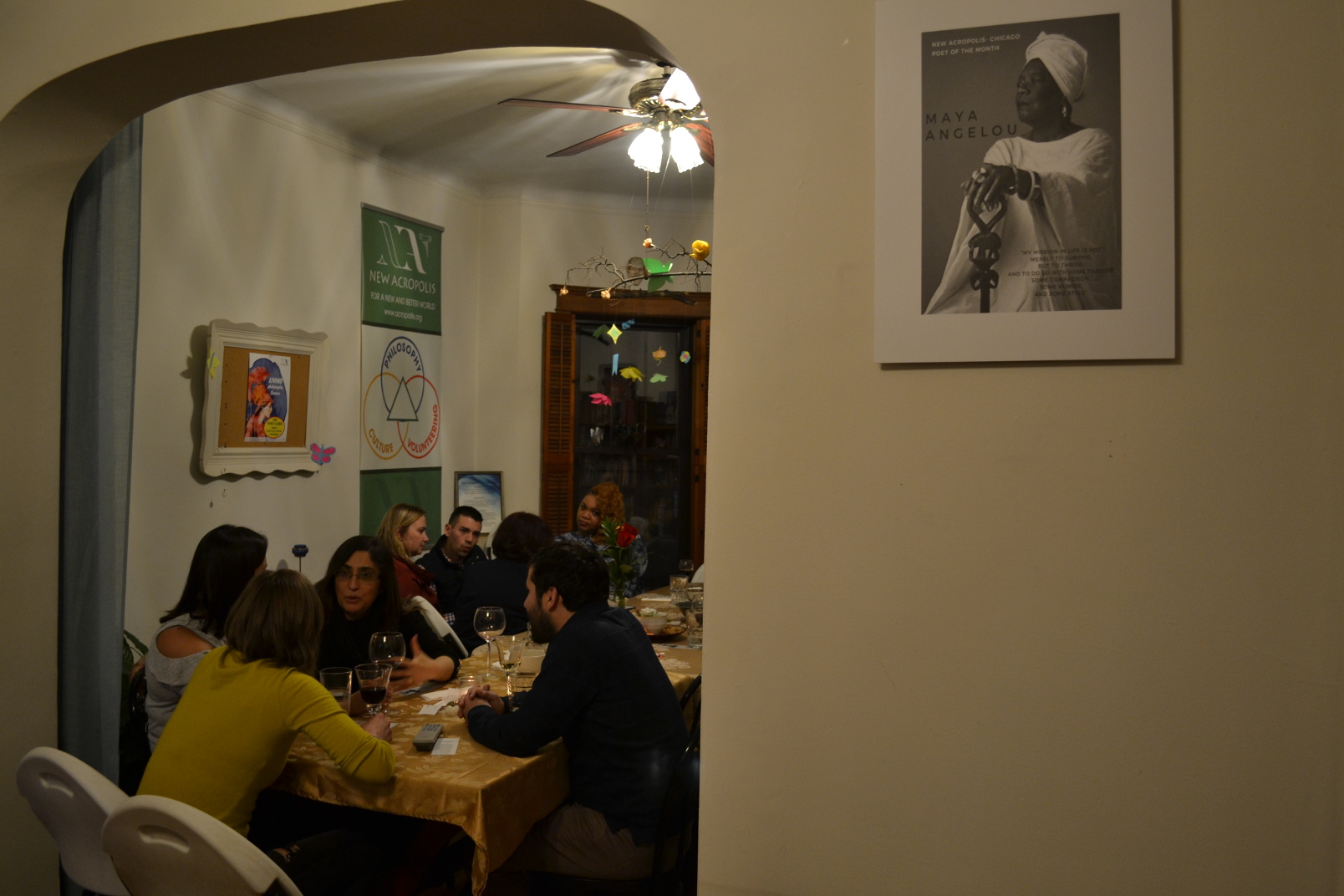 Socios y amigos de Nueva Acrópolis Chicago organizaron un encuentro para celebrar el 90 cumpleaños de Maya Angelou (escritora, cantante y activista por los derechos civiles estadounidense) con una velada poética. La cena incluyó debates y lecturas de su poesía, así como música compuesta según sus palabras.