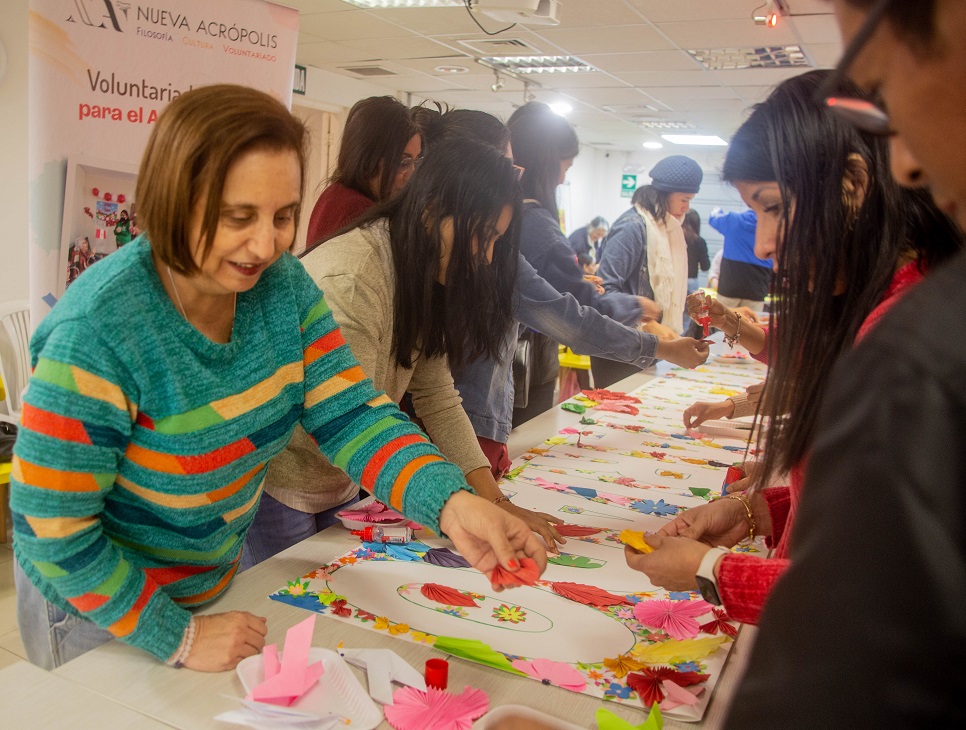 Con creatividad y trabajo colectivo, fueron tomando forma distintas obras cargadas de simbolismo: una imagen colectiva de Don Quijote, como emblema de los ideales y la valentía; un mural lleno de flores de valores, con la palabra Voluntariado brillando en el centro, recordándonos el poder transformador de la voluntad y la generosidad; y un collage que representaba la fuerza y la libertad del águila, con sus alas extendidas no solo como símbolo de vuelo, sino como una evocación de la trascendencia —ese impulso interior que nos eleva por encima de nuestras limitaciones y nos invita a desplegar lo mejor de nuestra naturaleza.