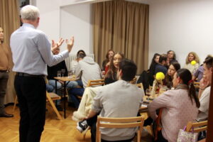 La segunda parte del evento fue práctica y social. Con una copa de vino tinto en la mano, al igual que nuestros antepasados griegos, mantuvimos un debate interactivo sobre la Justicia y su aplicación en la vida real. Los participantes asumieron roles de abogados, fiscales y jueces en un estudio de caso, seguido de una reflexión sobre nuestros “tribunales” internos y la necesidad de verdadera inteligencia y objetividad.