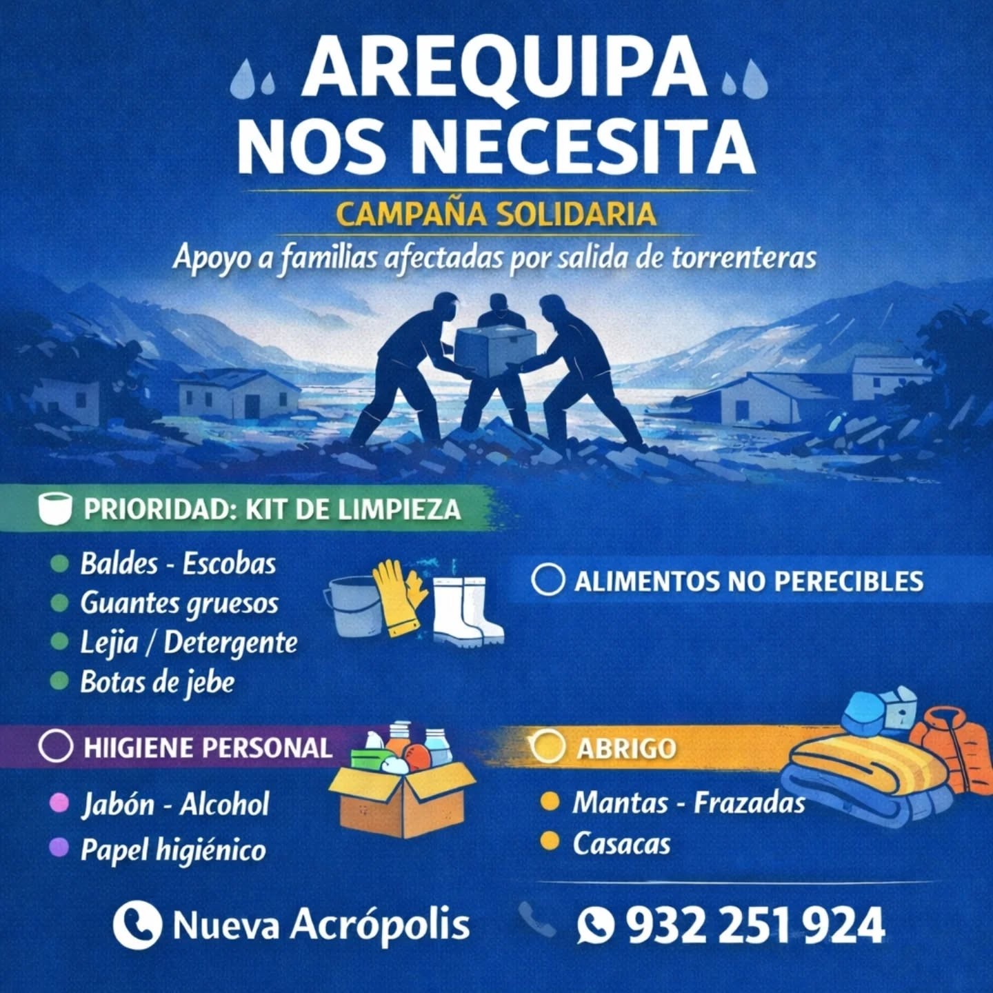 Ante esta difícil situación, los voluntarios de Nueva Acrópolis Filial Arequipa se hicieron presentes para brindar apoyo solidario en las zonas afectadas. A través de la organización y el trabajo en equipo, colaboraron en la distribución de ayuda, acompañamiento a familias damnificadas y acciones concretas de asistencia comunitaria.